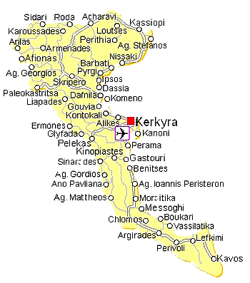irréguliers. Ses principales baies sont: Ypsos, Garitsa, lagune de Chalikopoulou (où se trouve également le pittoresque îlot de Pontikonissi), Mantoukiou, qui est aussi le port de plaisance de l'île etc...