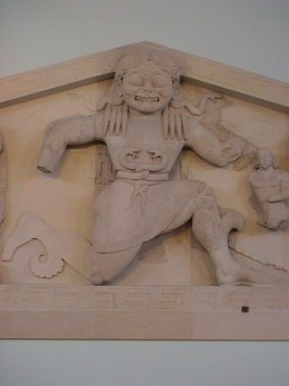 Le fronton en pierre provenant du temple dorique d'Artémis est gigantesque et unique en son genre. Il mesure 17 mètres de large et plus