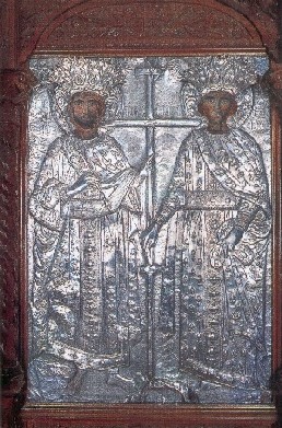 Icône recouverte d'argent représentant St Constantin et Ste Hélène