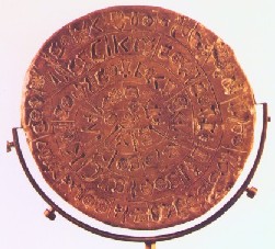 La véritable attraction de la salle est cependant le célèbre disque de Phaistos, un petit disque de terre cuite datable entre 1700 et 1600 av. J.?C. qui fut retrouvé dans le palais de Phaistos. Recouvert sur ses deux faces d'idéogrammes magiques disposés en spirale vers le centre, il compte 122 signes, groupés par 7 et qui restent encore à déchiffrer. |