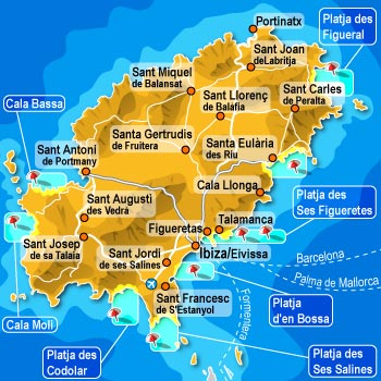 sont plus de 18 kilomètres de plages (plus de 50 plages se répartissent à travers tout le littoral d'lbiza) qui vous attendent sur l'Ile pour y choisir et y trouver votre bien-être, les vents qui vous conviennent et les activités que vous désirez pratiquer. Des plages familiales, sportives, isolées, sauvages, tranquilles, profondes, où s'allonger en douceur pour le bain de vos enfants: I'île d'lbiza, c'est 572 km2 avec des distances maximum par la route, allant de 15 à 40 kms, rien n'est loin, tout est à votre portée