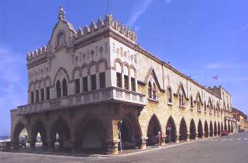 La cathédrale (ci-dessous) de Rhodes fut édifiée durant la seconde moitié de l'occupation italienne sur le modèle de l'église St-Jean qui s'élevait dans le Collachium, d'après les dessins du belge Rottiers.