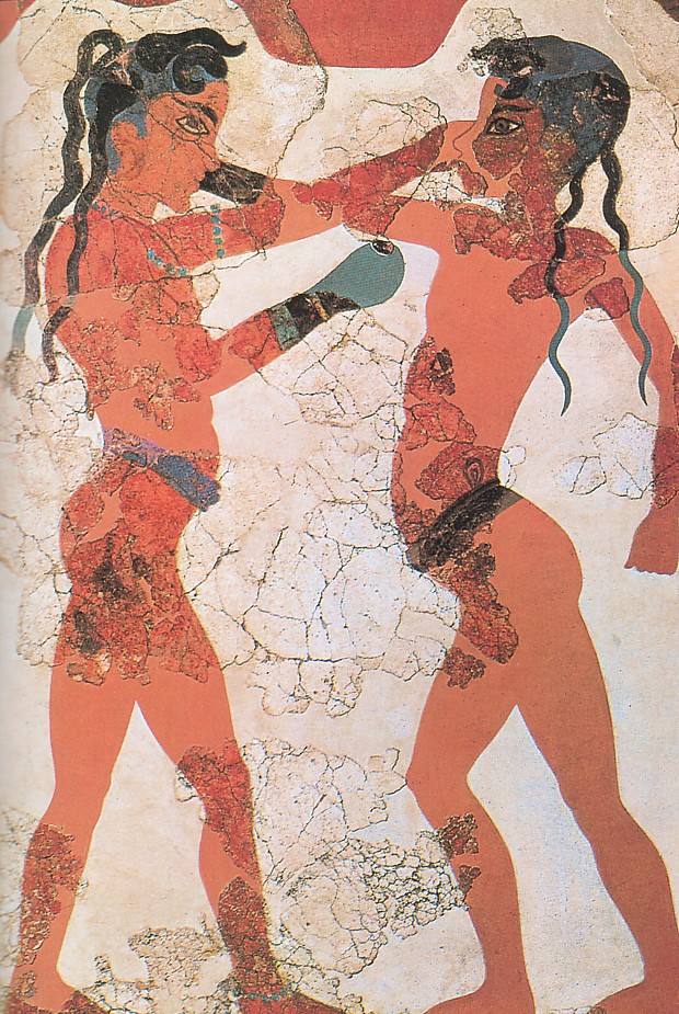 Les enfants représentent en fait des serviteurs d'une divinité car leur tête est en partie rasée comme celle du pêcheur. L'un des boxeurs porte des bijoux : des bracelets, un collier, des boucles d'oreille.