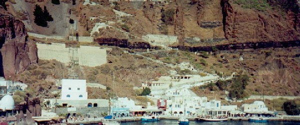 La gare routière centrale se situe au sud de la place principale de Fira. Toutes les lignes rayonnent à partir de ce point. Les bus partent généralement toutes les demi-heures entre 7 h et 21 h de juin à août, mais seulement toutes les 2 ou 3 heures le reste de l'année.